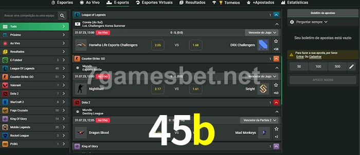 O 45b oferece uma grande seleção de opções de apostas em e-sports com probabilidades competitivas